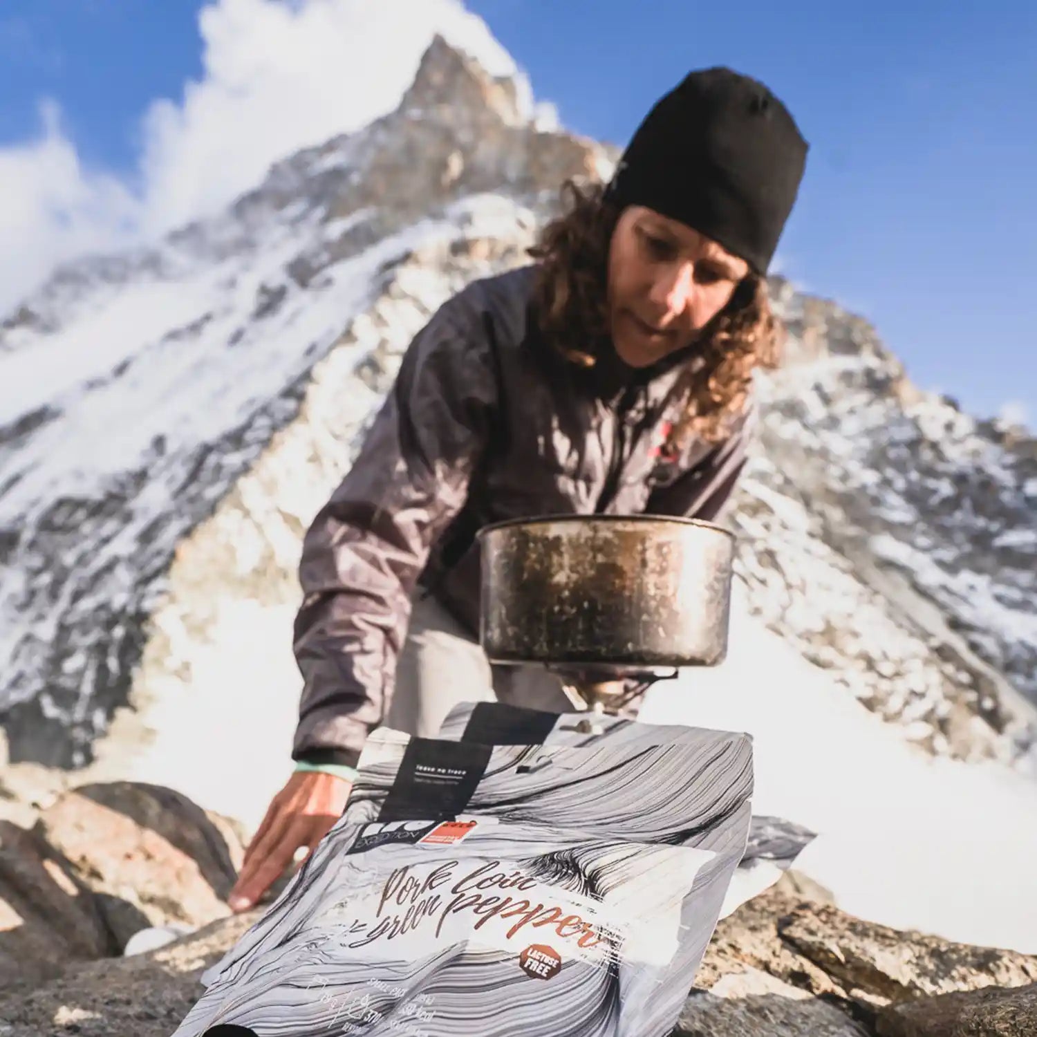 Gefriergetrocknete Mahlzeit: Schweinelende mit Kartoffeln und grünen Bohnen in grüner Pfeffersauce