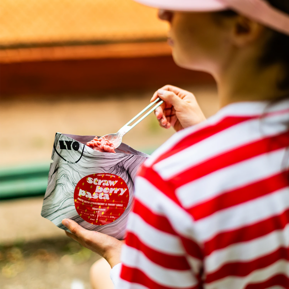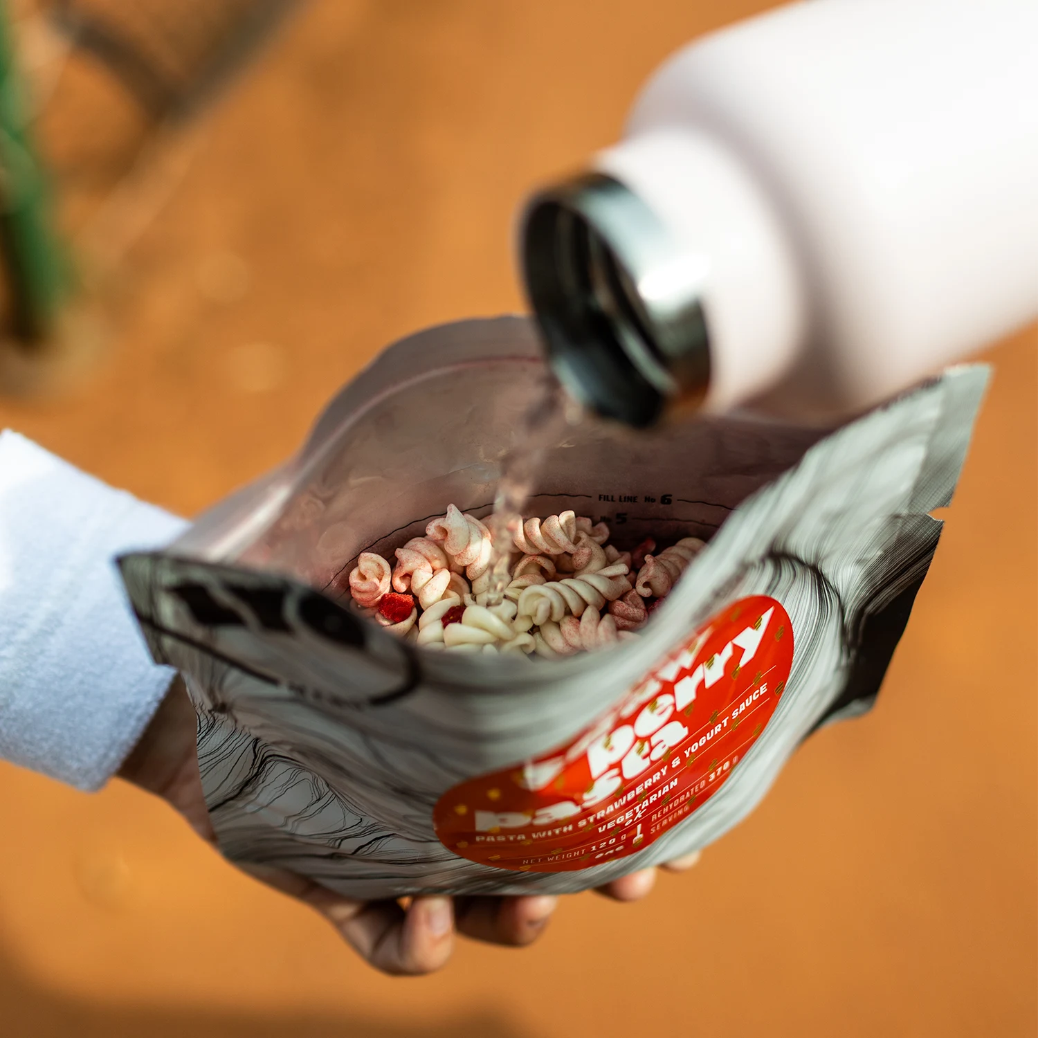 Comida liofilizada: Pasta con salsa de fresa y yogur